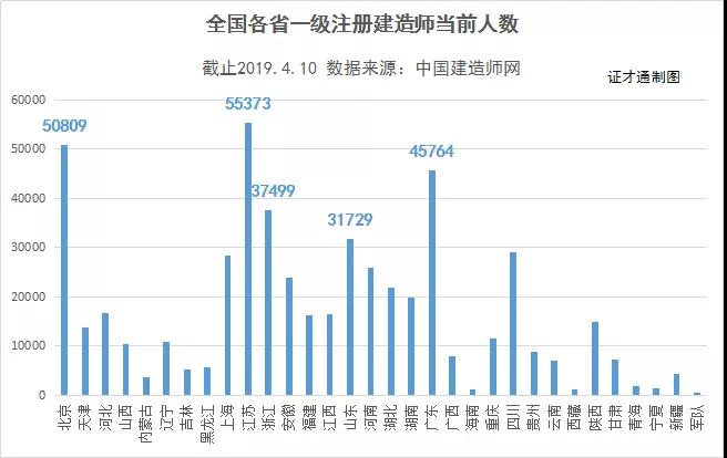 其中,江苏一级注册建造师当前人数最多,为55373人,接下来依次是:北京50809人,广东45764人,浙江37499人,山东31729人。