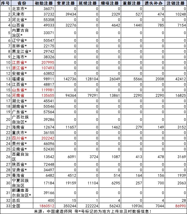 各省二级建造师注册情况具体如下表所示: